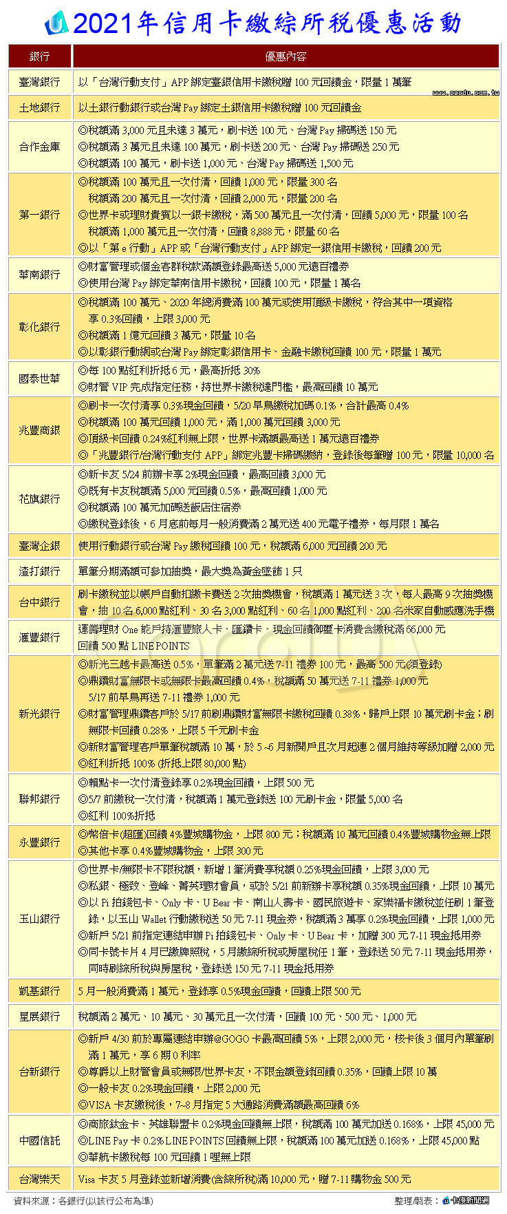 2021年信用卡繳綜所稅優惠活動,如下表: